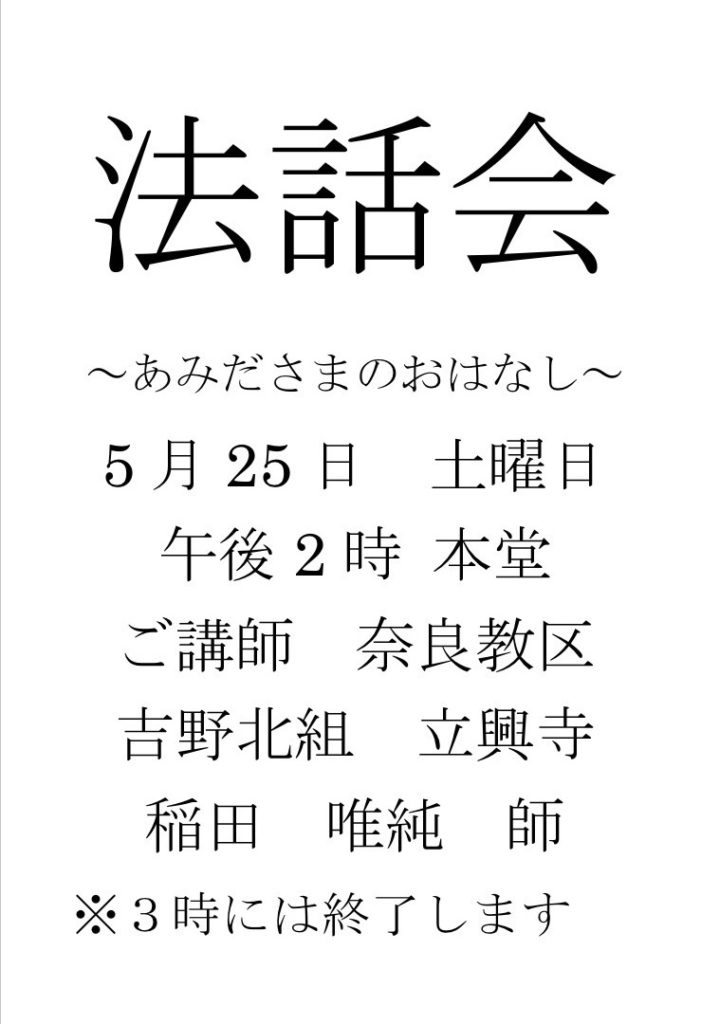 法話会のお知らせ 2024年5月20日 2024年5月25日(土)14:00〜 本堂にて法話会を開催いたします。 ご講師は奈良教区 吉野北組 立興寺 稲田 唯純師です。 皆さまお誘い合わせの上お参りください。