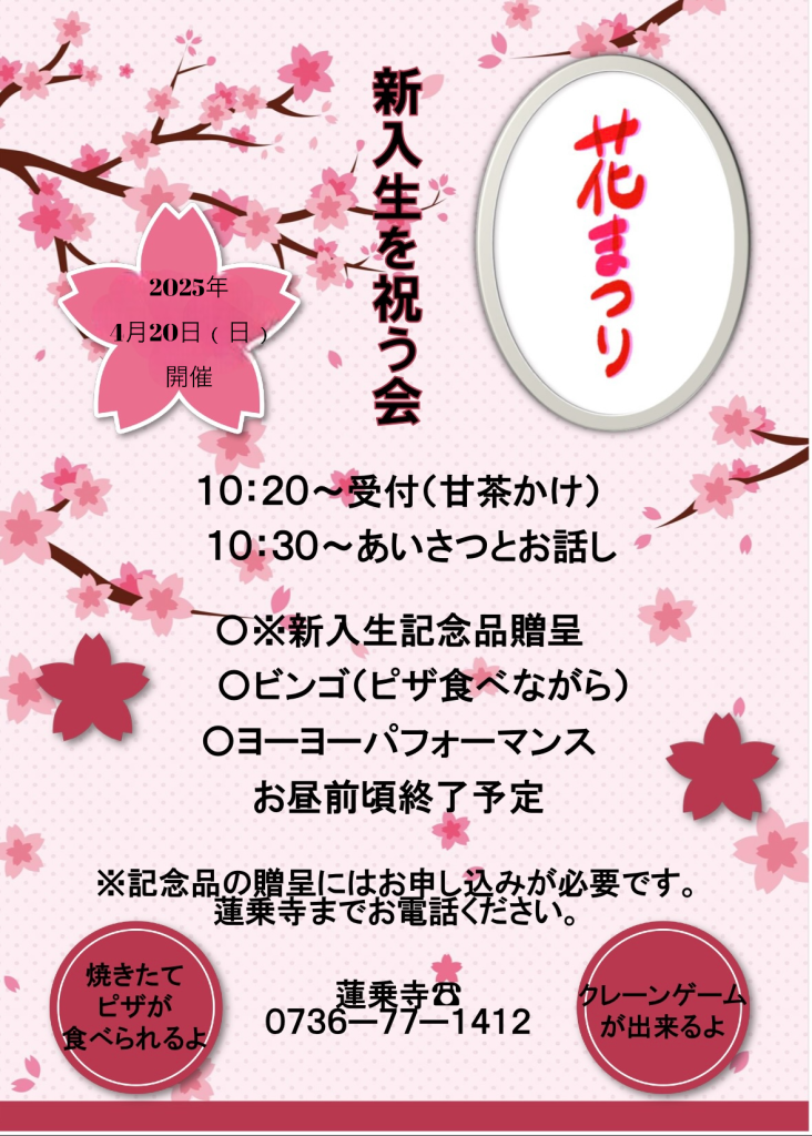ビンゴやその他の楽しい催しがございますので皆さまお誘い合わせの上ご参加くださいませ。新入生には記念品をお渡ししますので、2024年4月13日までに蓮乗寺に記念品のお申し込みをお願いいたします。